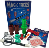 Set: includes 1 magic wand, 3 red ropes, 6 cards, 2 cups, 4 plastic coins, 1 ball vase (3 parts), 1 red ball, 3 rings, 1 SNAP IT (3 parts), 1 rubber band, 1 SPACE TIME TUNNEL (2 parts) and a 16-page instruction booklet.